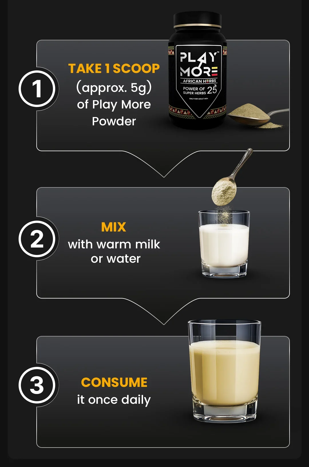 Play More is a natural health supplement made just for men. It’s packed with special African herbs and Ayurvedic herbs that have been trusted for hundreds of years.